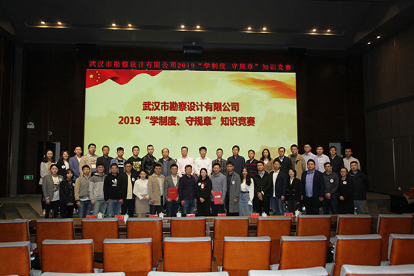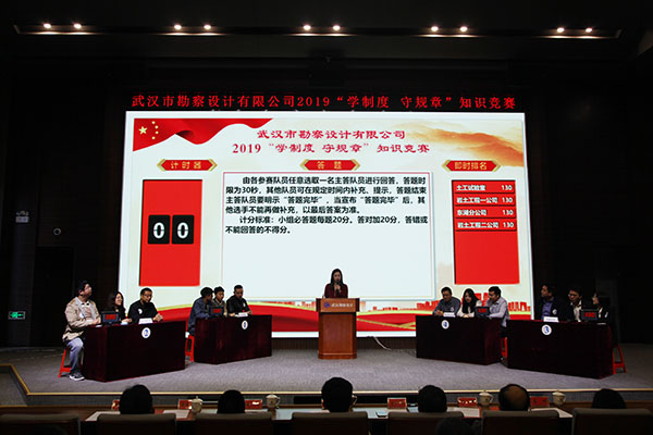 為進(jìn)一步加強(qiáng)員工對(duì)公司企業(yè)文化及各項(xiàng)規(guī)章制度的學(xué)習(xí)和認(rèn)識(shí),提高員工的綜合素養(yǎng),10月30日上午,公司首次舉辦的2019年度“學(xué)制度 守規(guī)章”知識(shí)競(jìng)賽活動(dòng)在測(cè)繪院307學(xué)術(shù)報(bào)告廳成功舉辦。公司董事長(zhǎng)廖建生,總經(jīng)理施木俊,副總經(jīng)理安永強(qiáng)、官善友、蔣濤,代理副總經(jīng)理熊劍,代理總會(huì)計(jì)師龔瑋親臨現(xiàn)場(chǎng)指導(dǎo)并觀看了比賽,公司各部門負(fù)責(zé)人及員工代表共計(jì)100余人參加了活動(dòng)。巖土工程一公司、巖土工程二公司、測(cè)繪工程公司、基礎(chǔ)工程公司、檢測(cè)監(jiān)測(cè)公司、設(shè)計(jì)中心、地質(zhì)環(huán)境中心、不動(dòng)產(chǎn)咨詢中心、東湖分公司、新區(qū)分公司、臨空分公司、土工試驗(yàn)室等12支生產(chǎn)部門代表隊(duì)共36名選手參加了此次比賽。