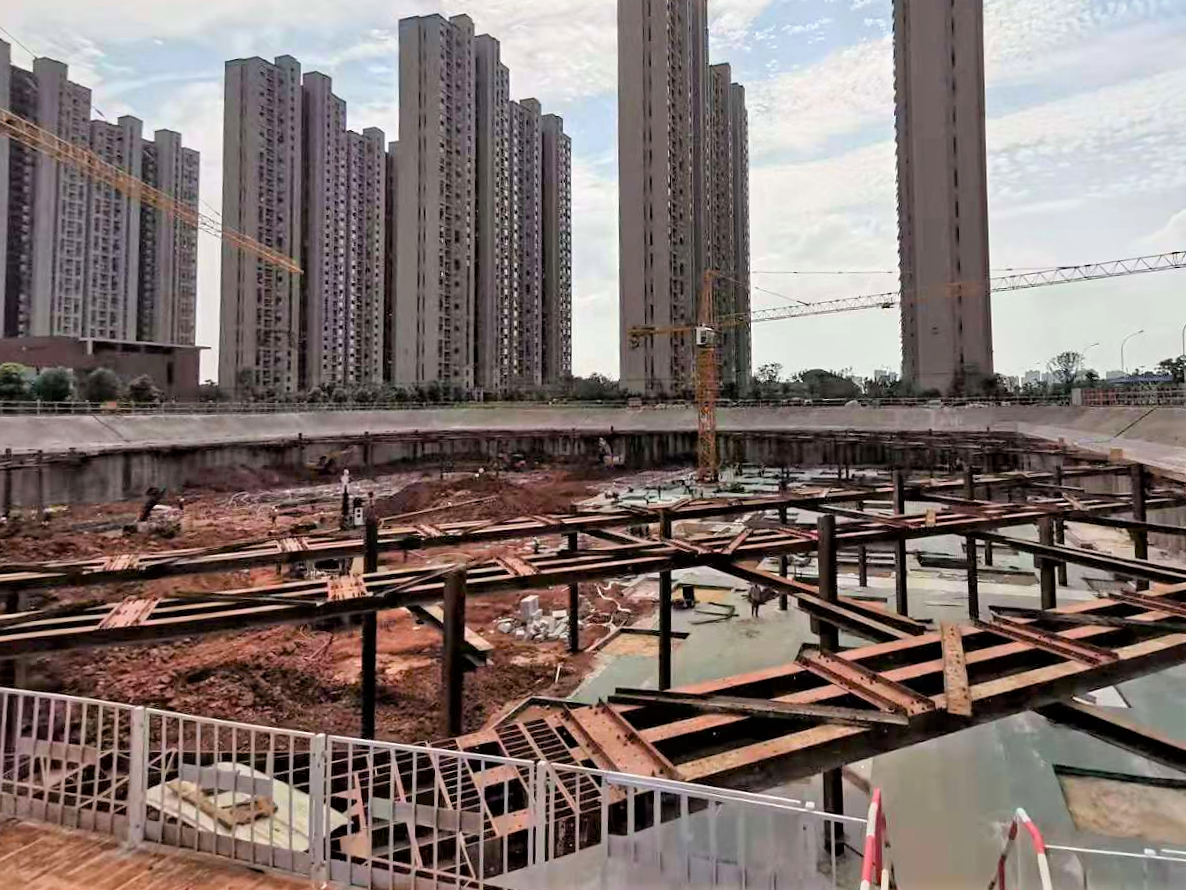 該項目位于武漢市洪山區(qū)青菱新區(qū),地下設(shè)兩層地下室,基坑開挖面積14600㎡,基坑周長476m,基坑開挖深度9.8m—13.6m。在項目方案設(shè)計階段,設(shè)計中心技術(shù)團(tuán)隊經(jīng)充分討論后決定大膽創(chuàng)新,采用型鋼組合支撐的綠色新工藝,該工藝是武漢市兩層地下室基坑工程中的首次成功應(yīng)用。