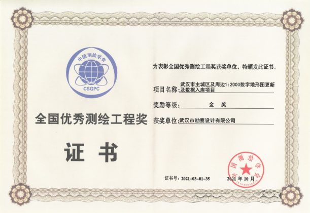 “武漢市主城區(qū)及周邊1:2000數(shù)字地形圖更新及數(shù)據(jù)入庫項(xiàng)目”榮獲2021年中國(guó)測(cè)繪學(xué)會(huì)全國(guó)優(yōu)秀測(cè)繪工程獎(jiǎng)金獎(jiǎng)