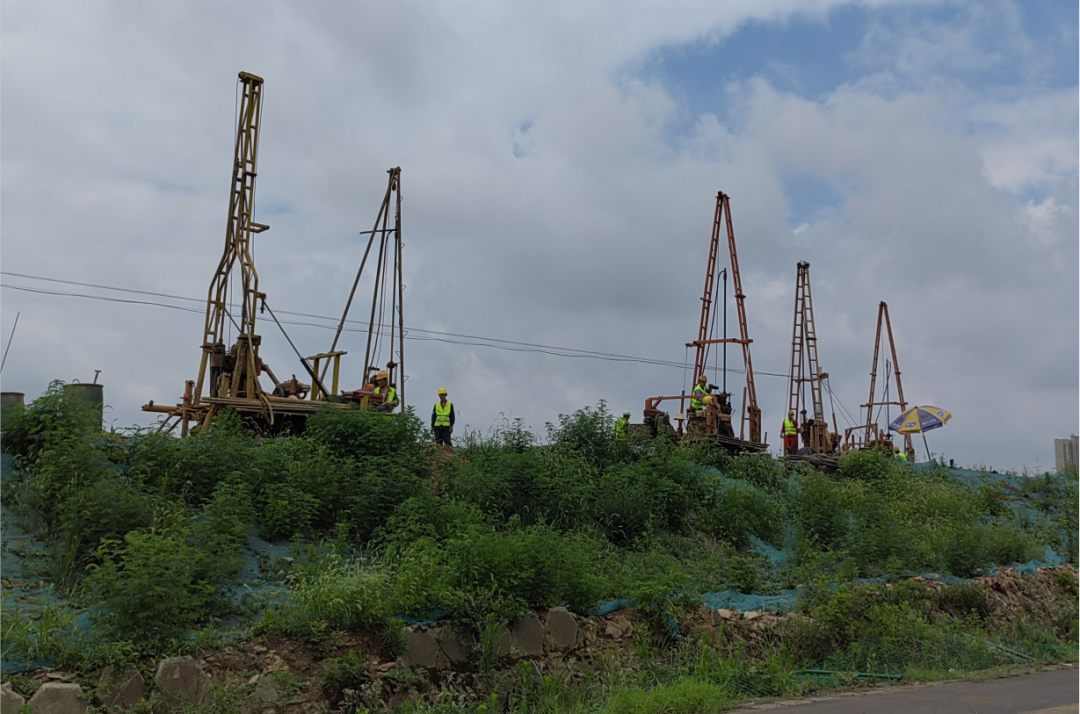 在施工勘察階段,根據(jù)業(yè)主要求,勘察需與施工同步進(jìn)行,彼時正值基坑開挖,作業(yè)面少,但項(xiàng)目任務(wù)重、時間緊。在接到業(yè)主進(jìn)場通知后,團(tuán)隊(duì)迅速召集了近百臺鉆機(jī)及相關(guān)作業(yè)人員,就作業(yè)面少問題,團(tuán)隊(duì)人員不斷與施工總包方溝通協(xié)調(diào)并制定施工、勘察方案,最終通過團(tuán)隊(duì)的拼搏努力及與總包方的密切配合,順利完成了施工勘察任務(wù)。