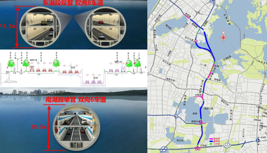 為更好地支撐城市空間發(fā)展,武漢市“十三五”規(guī)劃中要求“加大地下空間開發(fā)利用度,加強(qiáng)地下通道、地下停車場等地下交通設(shè)施建設(shè),啟動(dòng)實(shí)施‘負(fù)高架’工程,改善交通出行條件”。兩湖隧道作為世界上規(guī)模最大的城市湖底雙層超大直徑隧道,是武漢市重點(diǎn)市政工程,也是惠及武漢千家萬戶的重大民生工程。項(xiàng)目建成后,將在武昌片區(qū)形成一條南北向快速通道,可有效緩解二環(huán)線、珞獅南路、水果湖隧道等道路交通壓力,不斷完善區(qū)域路網(wǎng)體系,方便周邊地區(qū)居民出行。