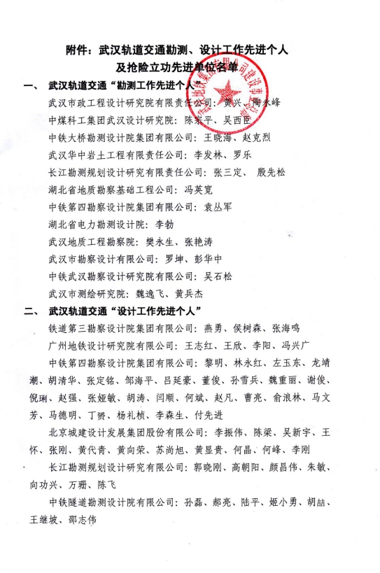 鑒于我公司在武漢市軌道交通3號(hào)線香惠區(qū)間地面塌陷搶險(xiǎn)工作中的突出表現(xiàn),武漢地鐵集團(tuán)有限公司建設(shè)事業(yè)總部授予我公司等6家勘察、設(shè)計(jì)單位“搶險(xiǎn)立功先進(jìn)單位”榮譽(yù)稱號(hào)。其中我公司在各單位中排在第一位。為激發(fā)武漢交通勘測、設(shè)計(jì)單位技術(shù)管理骨干的責(zé)任心和榮譽(yù)感,授予我公司羅坤、彭華中2位同志武漢軌道交通“勘測先進(jìn)個(gè)人”。(巖土一公司)