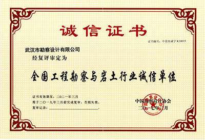 在公司領(lǐng)導(dǎo)和各部門的大力支持下,經(jīng)過公司生產(chǎn)經(jīng)營部精心的組織和認(rèn)真準(zhǔn)備,我公司順利通過中國勘察設(shè)計協(xié)會的復(fù)審,順利成為湖北省首批獲得“全國工程與巖土行業(yè)誠信單位”的企業(yè)。