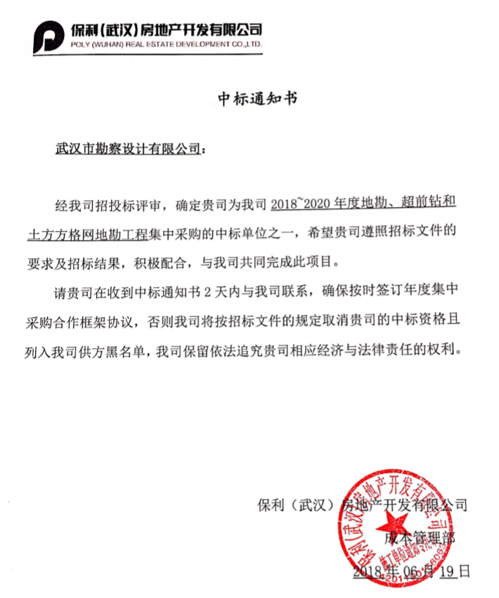 經招投標評審,我司被確定為保利(武漢)房地產開發(fā)有限公司2018-2020年度地勘、超前鉆和土方方格網地勘工程集中采購項目的中標單位之一。本次項目的中標是我司與保利地產武漢公司的又一次密切合作。